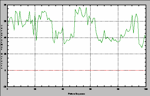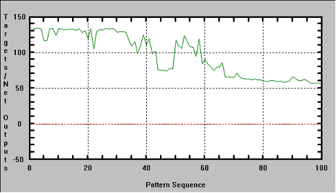 Меню NetGraph позволяет строить графики входные узлы / последовательность образцов (рис. 5.15) (в обратной задаче выходная величина ОУ является входом сети (рис. 5.16), в нашем случае девятым узлом входного слоя), и цель-отклик/последовательность образцов (рис. 5.17, 5.18), т.е. искомые управляющие воздействия и другие графики. Так же выходные значения можно сохранить в виде таблицы (рис. 5.19) или текстового файла (рис. 5.20).