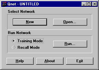 Главное меню является стартовой точкой как для запуска режима создания и обучения сети, так и для режима исследования обученной сети. Опции главного меню содержат: - New – создание новой модели нейросети с возможностью последующего обучения; - Open – открытие сохраненной модели нейросети для обучения или исследования; - Run – если выбрана опция «Training Mode», то нажатие этой кнопки приведет к запуску режима обучения. Можно обучать как новую, так и уже существующую нейросеть. Если выбрана опция «Recall Mode», то нажатие этой кнопки приведет к запуску режима исследования. Это используется для исследования обученных сетей с новыми наборами входов; - Help – вывод справки; - Exit – выход из «Qnet». После выбора режима обучения переходим к окну установок обучения. С помощью окна установок обучения (рис. 2.2) можно конфигурировать и изменять модель нейросети.
