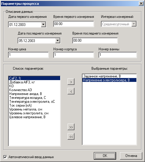 Пункт «Выход» – импортирует введенные данные во внутреннюю таблицу и закрывает окно. В случае автоматического ввода данных окно, изображенное на рис. 3.9, принимает следующий вид (рис. 3.12). После выбора номера цеха, корпуса, ванны и нажатию кнопки «ОК» происходит запрос к базе данных «Oracle», после чего данные передаются в таблицу (рис. 3.13). Работа «виртуального» электролизера происходит до тех пор, пока курсор в таблице «Реальные данные» не достигнет последней строки, после чего на экране появится сообщение, об остановке работы программы (рис.3.14). Для повторного использования реальных данных необходимо выполнить всю последовательность действий описанную выше. Если сообщение, изображенное на рис.3.14 не появилось на экране, например пользователь остановил работу электролизера, то достаточно либо нажать кнопку «Обновить», расположенную на панели инструментов, но тогда «виртуальный» электролизер начнет работу с первой строки таблиц, изображенных на рис. 3.10 и 3.13, или продолжить работу электролизера с помощью кнопки «Выполнить» до появления сообщения рис. 3.14.