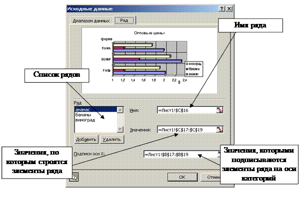 Каждый из объектов имеет набор собственных атрибутов, доступ к которым можно получить, выделив объект и вызвав команду Формат | Выделенный < Название объекта> ( Например: Формат | Выделенный ряд...). Группы атрибутов у некоторых элементов совпадают: § объекты, содержащие текст (оси, надписи, легенда), имеют атрибуты форматирования шрифта, размещённые на вкладке Шрифт (размер, стиль и т.д.); § геометрические объекты (элементы ряда, стенки, легенда и диаграмма целиком) имеют атрибуты заливки поверхности и оформления рамки (вкладка Вид). Подробнее рассмотрим два типа элементов диаграммы. Оси, как объекты, отображающие значения в качестве подписей к делениям, аналогично ячейкам, обладают атрибутами форматирования значений (вкладка Число). Кроме того у осей имеется набор свойств, определяющих вид шкалы (минимальное, максимальное значения и т.д.), которые размещены на вкладке Шкала. Ряд данных – это основной элемент диаграммы. Каждый ряд содержит один, или несколько элементов данных, по умолчанию имеющих одинаковый внешний вид (см. рис. 18). Ряд содержит данные, на основе которых и формируется диаграмма, доступ к списку рядов и к данным каждого из них можно получить, выполнив команду Диаграмма | Исходные данные… (см. рис. 18). Имя – определяет общее название ряда и может быть абсолютной ссылкой на ячейку или строковой константой. Значение свойства Имя отображается в легенде Значения – числовые значения, на основе которых рассчитываются размеры (высота, длина, угол сектора и т. д.) элементов данных. Значения могут быть представлены абсолютной ссылкой на одномерный диапазон (одна строка или один столбец) или одномерной константой-массивом. Подписи оси Х – значения, которые будут помещены в качестве подписей к делениям оси категорий. Значения могут быть представлены абсолютной ссылкой на одномерный диапазон (одна строка или один столбец) или одномерной константой-массивом. Этот параметр имеет одинаковое значение для всех рядов диаграммы, что вполне логично, поскольку ряды расположены на одной оси.