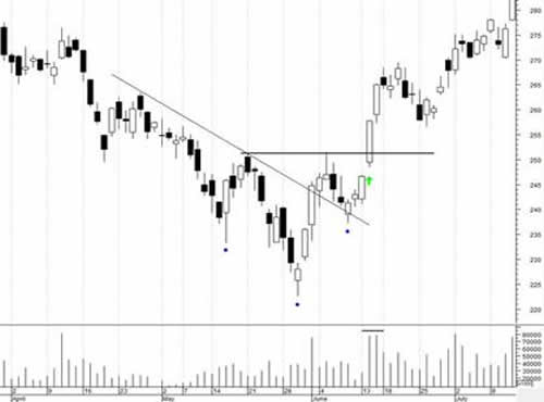 Пример 3. Перевернутая модель «Голова и плечи» сформировалась на акциях Газпрома в мае-июне 2007 г. Линия шеи горизонтальная, была пробита в середине июня, сильным ростом на больших объемах. Возвратный ход был, но линии шеи не достиг.