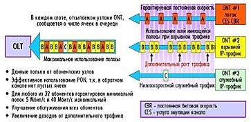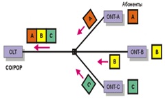 Для каждого направления передачи (к абоненту и от абонента) используется технология временного разделения каналов для каждой длины волны. Описание этих технологий представлено на рис. 5 и 6.