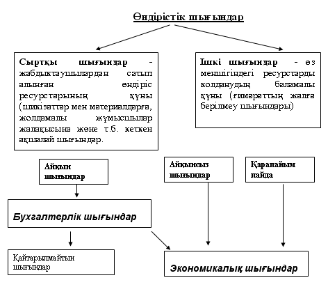 19-сурет. Ө ндірістік шығ ындар қ ұ рылымы Бухгалтерлік шығ ындар экономикалық шығ ындардан аз болады. Бұ л бухгалтерлік жә не экономикалық пайданың айырмашылығ ын кө рсетеді. Оларды былай анық тайды: