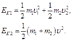 Интересным примером, где имеет место потеря механической энергии под действием диссипативных сил, является абсолютно неупругий удар. Так называется столкновение двух тел, в результате которого они соединяются вместе и движутся дальше как одно тело. Примером может служить столкновение шаров из пластилина или глины. Физически явления при столкновении тел довольно сложны. Сталкивающиеся теля деформируются, возникают упругие силы и силы трения, в телах возбуждаются колебания и волны и т. д. Однако, если удар неупругий, то, в конце концов, все эти процессы прекращаются, и в дальнейшем оба тела, соединившись вместе, движутся как единое твердое тело. Его скорость можно найти, не вдаваясь в механизм явления, а используя только закон сохранения импульса. Пусть шары движутся вдоль прямой, соединяющей их центры масс, со скоростями υ 1 и υ 2. Обозначим через υ общую скорость шаров после столкновения. Закон сохранения импульса дает