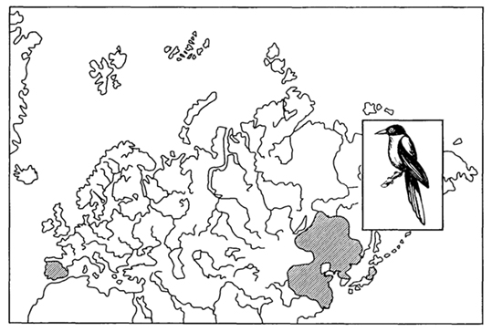 34. На рисунке представлен ареал голубой сороки (Cyanopica cyanus). Наблюдаемое разобщение (разрыв) данного ареала наиболее вероятно можно объяснить: а) миграцией вида из Азии в Европу; б) расширением ареала и освоением новых территорий; в) разрывом единого ареала во время последнего оледенения; г) тем, что это виды-двойники, возникшие от разных предков.