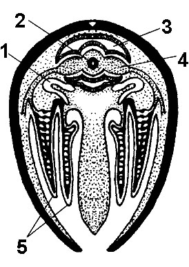 мах. 2, 5 балла] Соотнесите органы моллюска (А–К) с их обозначениями на рисунке (1 – 5).