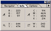 В окне палитры Info (Инфо) вы можете найти информацию о цветовых параметрах пикселя (группы пикселей) изображения, на котором установлен указатель мыши. Эта информация обычно рассчитана на цветовые модели RGB и CMYK и располагается в верхней части окна палитры. Для модели CMYK рядом с численными параметрами цвета в большинстве случаев стоит знак процента. Если вместо него вы увидите восклицательный знак, это означает, что цвет данного пикселя не входит в цветовое пространство модели CMYK. В нижней части окна палитры указаны текущие координаты указателя мыши и размеры проекций выделенной области на горизонтальную и вертикальную оси. Информация, приводимая в палитре Info (Инфо), зависит от того, какой рабочий инструмент является активным. К примеру, при использовании инструмента Measure (Измеритель) в палитре отображается следующее: