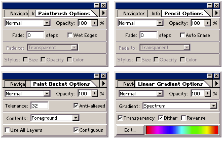 Палитра Options (Параметры) Палитра применяется для настройки параметров рабочих инструментов программы. Текущее название палитры и ее содержимое зависят от того, какой инструмент выбран. На рис.7 показаны четыре облика этой палитры – при работе с инструментами Paintbrush (Кисть), Pencil (Карандаш), Paint Bucket (Заливка) и Linear Gradient (Линейный градиент). Например, при работе с кистью вы можете задать в этой палитре следующие параметры: режим смешения цветов (в раскрывающемся списке вверху слева), коэффициент непрозрачности краски (параметр Opacity), размер мазка кисти (Fade) и признак размытости его краев (флажок Wet Edges).