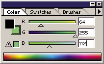 С помощью команд меню палитры можно выбрать одну из следующих цветовых моделей: Grayscale (Градации серого), RGB, HSB, CMYK и Lab. Кроме того, здесь предусмотрена возможность замены цветовой модели для синтезатора. Установите на нем указатель, щелкните правой кнопкой мыши и в появившемся контекстном меню выберите соответствующую модель: RGB, CMYK, Grayscale или двухцветную (Current Colors). Если указанный вами цвет не может быть отображен в цветовом пространстве модели CMYK, то внизу слева появятся заключенный в треугольную рамку восклицательный знак и небольшой квадрат, окрашенный цветом, который близок к заданному, но входит в число цветов, допустимых для данной модели. Щелчок на данном квадрате приводит к замене этим цветом того, который был задан ранее.