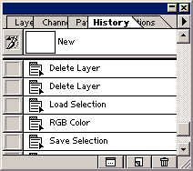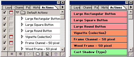 Рис.14 Палитра History Палитра Actions (Операции) предназначена для автоматизации обработки изображений путем создания и многократного применения сценариев, представляющих собой наборы команд, часто используемых при обработке. На рис.15 изображены два варианта этой палитры: слева – обычный, справа – кнопочный. Последний применяется лишь в режиме воспроизведения сценариев (к его использованию можно перейти с помощью команды Button Mode меню рассматриваемой палитры).