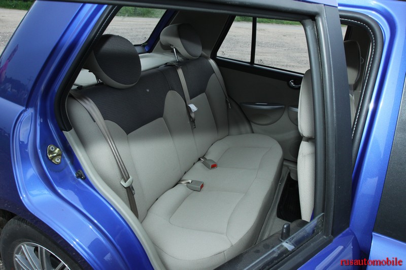 Кресла обшиты маркой и визуально непрочной тканью. Нет упора для левой ноги, хотя сама площадка на арке позволяет разметить такой упор. На заднем сиденье подголовников два, а ремня безопасности три, причём средний - полноценный трёхточечный. Интересно, зачем, если двое взрослых помещаются сзади почти без зазора?
