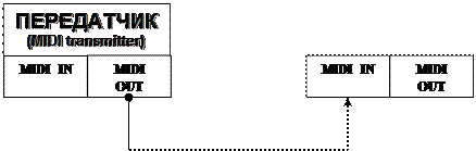 1. FADE TIME: время перехода, т.е. период, за который выходной сигнал меняется от 0 до 100%, или от 100 до 0%. 2. SINGLE MODE: программы воспроизводятся одна за другой, их номер выводится на МФИ, скорость регулируется фейдером SPEED. 3. MIX MODE: все выбранные программы воспроизводятся одновременно, скорость регулируется по начальным установкам. 4. CHASE#SCENES: выбираются программы, записанные на мастера (пресет В), при воспроизведении нажатие клавиши BLIND блокирует уровни каналов на выходе до тех пор, пока не разблокируется клавишей НОМЕ. 5. FADE TIME & SPEED TIME: Индикация времени на МФИ имеет следующий формат – 1 мин. 15 сек. – 1.15, 4 мин. 35 сек. – 4.35, но при этом следует наблюдать за разметкой фейдера, т.к. 11, 5 сек. – 11.5, 1, 5 сек. – 1.50. 6. Передача и прием MIDI сообщениий: А: Коммутация MIDI–приборов в одну линию – «открытое кольцо»: