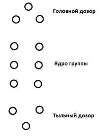 щего товарища для того, чтобы держать постоянный вер- бальный контакт с окружающими тебя бойцами. Напр.: Если группа вступает в б/контакт, подаётся команда: «Контакт на 3 часа!». Остальные громко и отчётливо её дуб- лируют. В этот же момент вся группа приводится в движение. Головной дозор становится левым флангом и совершает неглу- бокий обход в сторону, где увидели противника. Тыльный дозор соответственно становится правым флангом и Аналогично совершает неглубокий обход в ту же сторону. Правая колонна ядра группы становится «головняком», берущим на себя весь огонь. Левая колонна ядра группы становится тыльным дозором и занимает позиции в сторону, противную той, откуда идёт стрельба. Итого получается своебразная подкова. Движение группы по лесу Должно соблюдать цвето- и шумомаскировку. Необходимо ступать сначала на пятку, затем переходить на носок, с целью, если начнёт под ногой хрустеть, передвинуть носок в другую сторону. Радиоэфир должно оставлять свободным, а общаться внутри группы только жестами (по возможности). Постоянно по мере продвижения анализировать местность на предмет занятия хороших позиций в случае б/контакта, равно как и на предмет возможных засад. В головняк ставятся пулемётчики, либо автоматчики с увеличенными магазинами. В ядре идут преимущественно стрелки и снайпера во главе с командиром группы. В тыльник назначаются пулемётчики и стрелки, т.к. в любой момент тыльник может стать головняком при б/контакте. При попадании в засаду головняка, остальная группа по возможности должна обходить место б/контакта сбоку с целью ударить во фланг противнику и дать возможность головняку оттянуться к группе.