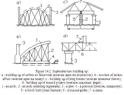 The erection technique of a superstructure depends on the span type, its dimensions and material. The span length for motorway bridges usually varies between 6 and 42 m. In the case of railway bridges the spans may be up to 34.2 m long. For short spans the choice of bridge types is very wide even for heavy loadings. For medium spans, the choice is still wide enough, but for long spans, the choice is restricted to continuous lattice girder, cantilever lattice and steel lattice bridges. When the spans are in excess of 457.2 m, the stiffened suspension bridge is the only suitable form. The following erection techniques have been developed for building different bridge structures – simple setting of discontinuous beams; erection by protrusion; launch and balanced cantilever erection. The simplest erection technique is used for single beam spans (fig. 14.1a). Standard reinforced concrete beams are produced by casting yards, shipped to the site, and set in place by cranes (fig. 14.1a). For short spans, steel beams are usually formed as a single unit. At the site, they are placed parallel to each other, with temporary forms between them so that a concrete deck can be cast on top. The beams usually have metal pieces welded on their top flanges, around which the concrete is poured. These pieces provide a connection between beams and slabs, thus producing a composite structure. When a bridge is designed as a continuous one the builders put simple beams on two supports, which join them into a continuous beam. For longer spans, steel beams are made in the form of plate girders. A plate girder is an I-beam consisting of separate top and bottom flanges welded or bolted to a vertical web. While beams for short spans are usually of a constant depth, beams for longer spans are often deeper at the supports and shallower at mid-span. They are called haunched beams. Haunching stiffens the beam at the supports, thereby reducing bending at mid-span. In general, shorter spans are built with beams, hollow boxes (box girders), trusses and arches, while longer spans use cantilever, cable-stay, and suspension forms. The next, span erection method is erection by protrusion. This method is used to construct very long bridge spans by employing reinforced concrete continuous girders, which are cast on the bank and then set to the place by pushing (fig. 14.1b). While being pushed, the girder works as a cantilever resisting the dead weight. As reinforced concrete has rather high density builders use a launching nose to reduce bending in the girder (fig. 14.1b). This technique has its disadvantages, which clearly limit its use: the concrete has to be prestressed in advance, and it needs time to reach a certain density.