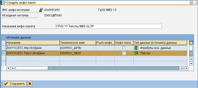 Теперь тексты можно загрузить из исходной системы SAP. Для этого надо создать инфо-пакет для исходной системы IDES R/3 (T90CLNT090) со следующим описанием: ГРXX YY Тексты МВЗ OLTP