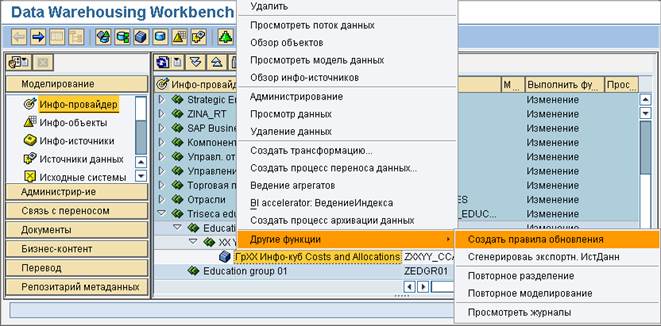 В качестве подготовки к загрузке переменных данных необходимо соединить инфо-источник 0CO_OM_CCA_1 с инфо-кубом ZXXYY_CCA. Это осуществляется посредством правил обновления.