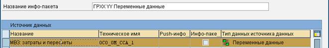 Теперь возможно пополнение инфо-куба переменными данными из области учета по МВЗ. Перейдите к инфо-источнику 0CO_OM_CCA_1 Затраты и перерасчеты и создайте инфо-пакет (ГРXX YY Переменные данные) для своей исходной системы SAP. Во избежание увеличения времени обработки операций ограничьте выбор контроллинговой единицей 1000, интервалом МВЗ 1000-2300 и периодом 003.1999.