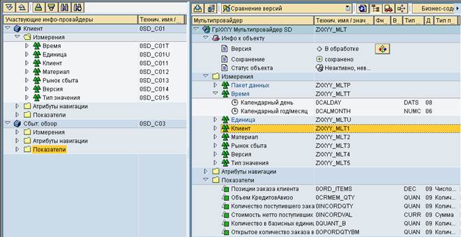 В последующем окне можно выбрать объекты, задействуемые (релевантные) в мультипровайдере. Из списка инфо-кубов выберите 0SD_C01 (клиент) и 0SD_C03 (сбыт). Подтвердите выбор.