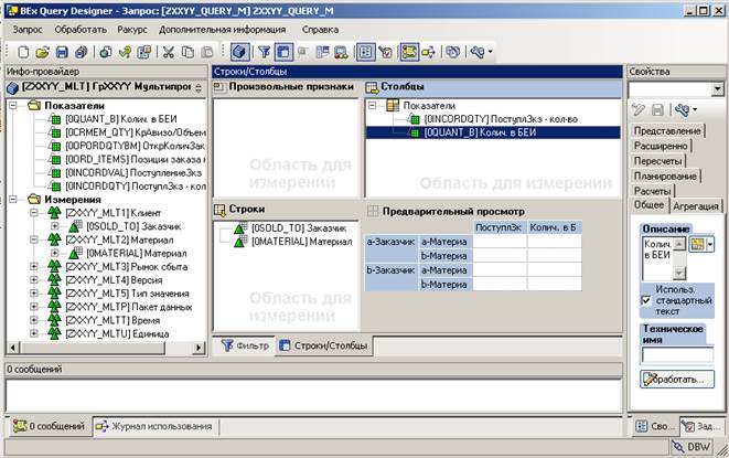5. в окне редактора отчетов нажмите на Rows/Columns 6. Методом перетаскивания переместите признаки Клиент (0SOLD_TO) и Материал (0MATERIAL)в строки, а показатели «Количество поступившего заказа в базисной единице измерения» (0INCORDQTY) и «Количество в базисных единицах измерения» (0QUANT_B) в столбцы. Для того, чтобы отобразить технические имена надо нажать на кнопку «