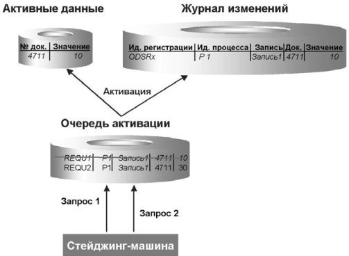 В этом разделе рассматривается пример, иллюстрирующий результаты загрузки и активации данных в ODS-объекте. Предположим, что в ODS-объект загружены два запроса REQU1 и REQU2. Это можно выполнить последовательно или параллельно. В процессе загрузки оба запроса направляются в очередь активации.