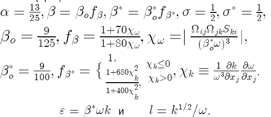 Как легко можно проверить, величина cω равняется нулю для двумерных течений. Зависимость b от cω , взятая из работы Поупа (1978), имеет существенное влияние для круглых и радиальных струй. С одной стороны, новые диссипативные коэффициенты имеют очень малое влияние в пограничных слоях, поскольку величина ω вблизи стенки довольно вели- ка, так что ck и cω малы. Это очень важно, так как старая модель Вилкокса (1988) хорошо прогнозировала именно характеристики пограничных слоев. Новая модель в этом отношении практически идентична старой. С другой стороны, k и cω значи- тельно больше для свободных сдвиговых течений. Следовательно, новая модель более диссипативна в сдвиговых слоях по сравнению со старой. Это существенно по той причине, что старая версия приводила к ускоренному расширению сдвиговых слоев по отношению к данным измерений. Новая модель свободна от этого недостатка. Функции f b и f b*, как и величины a и bo, калиброваны, чтобы прогнозируемые характеристики для дальних следов, слоев смешения, круговых и радиальных струй были согласованы с измеренными. Таким образом, предложенная Вилкоксом (1998) модель представляется более точной для расчета сложных типов течений, поскольку она точнее отображает их составные, характерные элементы (пограничные слои, следы, струи). Отметим, что дефект старой модели Вилкокса фактически устраняется включением в правую часть уравнения для ω так называемого перекрестного диффузионного члена cω .