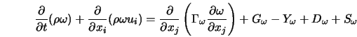 Как и в стандартной k-w модели в этих уравнениях Gk представляет собой генерацию кинетической энергии турбулентности градиентами осредненного течения, а Gw – генерацию w. Гk, Гw - эффективную диффузию k и w, Yk, Yw - диссипацию k и w вследствие действия турбулентности, Dw - поперечная диффузия, Sk, Sw - источниковые члены, определяемые пользователем. Генерация k вычисляется так же, как и в стандартной k-w модели. Коэффициент эффективной диффузии рассчитывается по тем же формулам, но турбулентная вязкость определяется иначе