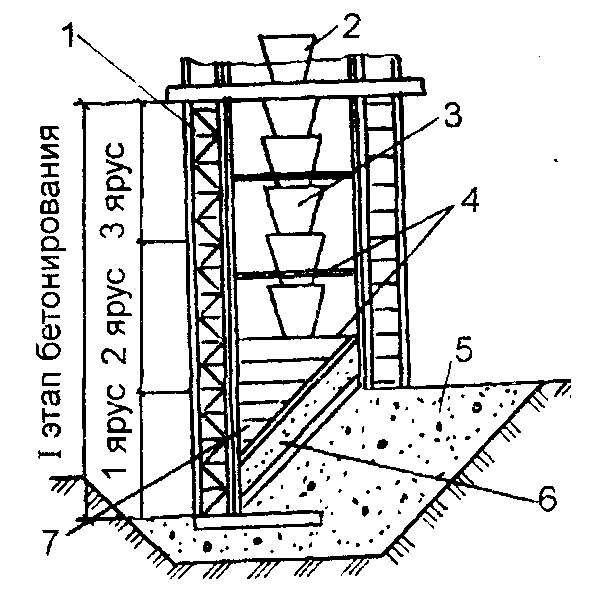 Рис 2.15. Схема возведения стены опускного колодца: 1 - опалубка стены колодца; 2 -воронка для приема бетонной смеси: 3 - гибкий хобот; 4 - арматурный каркас; 5 - щебеночная призма; 6 - плиты опалубки; 7 -нож колодца Стены колодца при бетонировании разбивают на ярусы, а ярусы на блоки. Высота яруса определяется расчетным сопротивлением грунта под ножом, конструкцией временного основания и производительностью крана. Укладку бетонной смеси в стены опускных колодцев выполняют следующим образом: при вст = 0, 5 м, hукл< 2 м смесь подается на площадки лесов, затем по лоткам к месту укладки; при вст = = 0, 5 - 1, 2 м, hук >.3 бетонирование ведут через звеньевые хоботы с шагом 3 м по" периметру стены; при вст > 1, 2 м разгрузку бадей производят непосредственно у места укладки. Распалубку ножа и нижнего яруса колодца начинают только после достижения бетоном 100%-й проектной прочности. Верхние ярусы колодца можно распалубливать при 70%-й проектной прочности. № 11