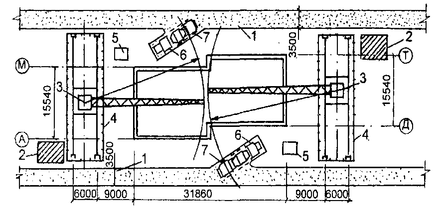 4 – укрупненный блок; 6 – монтажный кран БК – 1000; 7 – центральное опорное кольцо; 8 – центральная временная опора; I – V – последовательность монтажа блоков и демонтажа траверс-распорок