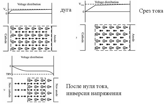 При нормальном функционировании дуги наибольшая концентрация плазмы наблюдается на катоде в катодных пятнах. При достижении нуля тока катодные пятна перестают функционировать и плазма свободно разлетается по направлению к аноду и в стороны. При инверсии напряжения остаточная плазма эмитирует электроны в направлении бывшего катода (сейчас анода) и ионы в направлении бывшего анода (сейчас катода) Но концентрации плазмы на новом катоде оказывается недостаточно для образования новых катодных пятен.
