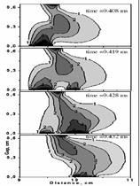 Таким образом минимизируется процесс разрушения контактов. В AMF контактах перед лицевой поверхностью располагают катушку, создающую продольное магнитное поле. В таком поле электроны становятся мене подвижными и разрядный столб приобретает распределенный диффузионный характер. В данном случае дуговой столб остается стационарным. Детальные фотографии с различными светофильтрами показывают, что на катоде под диффузным столбом все равно существуют катодные пятна. Характер дугового столба для случаев TMF AMF показан на рис.7.7