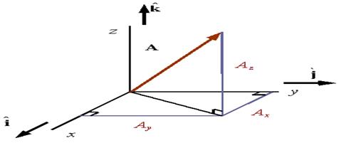 The system shown is a right-handed system since the thumb of the right hand points in the direction of z if the fingers are such that they represent a rotation around the z -axis from x to y. This system can be changed into a left-handed system by reversing the direction of any one of the coordinate lines and its associated base vector. In a rectangular coordinate system the components of the vector are the projections of the vector along the x, y, and z directions. For example, in the figure the projections of vector A along the x, y, and z directions are given by Ax, Ay, and Az, respectively.