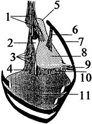 Рис. 4. Связки перикарда. По Рувьеру и Сули. 1. Позвоночно-перикардная связка. 2. Верхняя полая вена. 3. Корень правого легкого. 4. Диафрагмально-перикардная связка: справа. 5. Дуга аорты. 6. Верхняя грудинно-перикардная связка. 7. Грудина. 8. Перикард. 9. Нижняя грудинно-перикардная связка. 10. Передняя диафрагмально-перикардная связка. 11. Диафрагма.