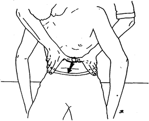 Пациент находится в том же положении сидя, пальцы расположены на подреберном крае по пупочно-акромиально-ключичной оси. Манипуляция состоит в поднятии вверх и назад большой бугристости и верхней части большой кривизны. Мы множество раз проверяли этот метод на усилителе Брийянса в процессе рентгенографии желудка и наблюдали подъем малой бугристости на 5 см. По мере продвижения лечения увеличивайте изгиб пациента, чтобы продвинуть руку как можно выше безболезненным образом, поскольку сокращение мышц живота тут же изгонит ваши пальцы, и заканчивайте левым вращением корпуса, что повысит расстояние от большой бугристости до малой бугристости. В конце маневра постепенно выпрямите пациента, вытягивая пальцами желудок вверх и влево. Расстояние от пупка до мечевидного отростка увеличивается, принуждая малую бугристость подниматься.