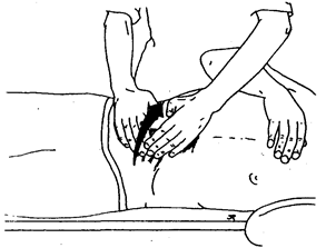 Ее можно спутать с маневрами прямого нажима. Ее целью является повышение дуодено-поджелудочно-желчного транзита (и расслабление мышечных волокон). Врач надавливает ладонью руки на пупочно-срединно-ключичную линию в 3 см над пупком. Между рукой и этим соединением находится передняя стенка живота, большой сальник, поперечная часть ободочной кишки и тонкая кишка в соответствии с их расположением, передняя стенка Д2, внутри же - поджелудочная железа и снаружи - почка. Пациент находится в положении лежа на спине. Нажим является медленным вращательным надавливанием в направлении часовой стрелки и обратно до тех пор, пока не прекратится движение и область не расслабится. Часто в этот момент слышны звуки характерного протекания. Мы не посвятили главу поджелудочной железе, поскольку невозможно, пальпируя ее, отделить ее от двенадцатиперстной кишки. Мы не можем доказать, что манипуляция двенадцатиперстной кишки повышает метаболизм и эвакуацию поджелудочной железы, и предпочитаем оставаться в строго области реальности. Следует отметить, что печеночно-поджелудочный сфинктер Одди расположен ниже при желудочных птозах, и его следует рассматривать при дуоденитах и язвах двенадцатиперстной кишки.