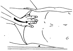Рис. 111. Тест подвижности мочевого пузыря: положение лежа - на спине. Поместите ладонь вашей руки непосредственно над симфизом, пальцы в направлении пупка. Пациент находится в положении лежа на спине, согнув ноги. Вы должны почувствовать во время вдоха, как ваша ладонь направляется назад и вверх к пупку.