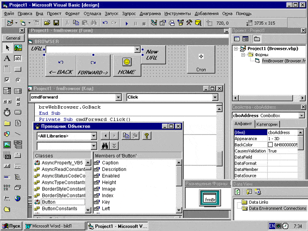 Обычный проект может быть создан с помощью объекта Standard EXE, рис. 1.1. Некоторые пиктограммы окна позволяют стартовать Wizards - это программы-мастера, помогающие пользователю при создании проекта. Главное меню Главное меню в верхней части окна Visual Basic, рис. 1.2. обеспечивает доступ к IDE - Integrated Development Environment. Среда разработки может иметь многодокументный (MDI - Multiple Document Interface) или простой (SDI - Simple DI) вид в зависимости от установки соответствующего флажка (Инструменты
