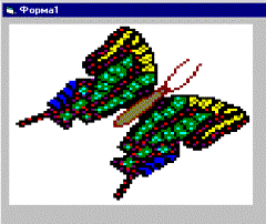 · Для того, чтобы поместить i-кадр на экран, нужно свойству Picture объекта Image (Image.Picture) присвоить значение свойства Picture1(1). Picture, а реализующая элементарную анимацию программа представлена ниже. · ввести код, данный ниже, затем стартовать проект; для остановки выполнения сделать щелчок на командной кнопке. (General) (Declarations)Dim i As Integer ' инструкция описания переменной, см. нижеPrivate Sub Form_Load()i = 0End SubRem присвоить значение индексу элемента массива Picture1(i)Private Sub Timer1_Timer()Rem свойству Picture элемента управления Image присвоитьRem значение свойства Picture элемента управления PictureImage1.Picture = Picture1(i).Picturei = i + 1If i = 2 Then i = 0 End SubPrivate Sub Command1_Click()End ' закончить выполнение программыEnd Sub Пояснения. При загрузке формы в память начинает выполняться процедура Form_Load(), где номеру кадра i присваивается значение 0. Сразу же начинает выполняться процедура Timer_Timer(): на экран Image выводится кадр с индексом 0 (бабочка - Bfly1), следующая строка кода увеличивает номер кадра (i= i +1). В следующей строке проводится поверка номера кадра и если он не равен 2, то на экран выводится второй кадр кадр (i=1, бабочка - Bfly2). При повторном выполнении кода переменной i присваивается значение 0 и происходит смена кадра, рис. 1.7. - бабочка машет крыльями.