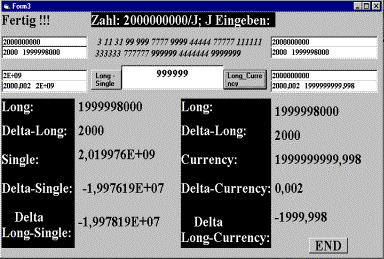 Проводятся расчеты ошибок вычислений (DelLong, DelSing) при расчетах с использованием данных типа Long, Single, вычисляется итоговая ошибка. Далее проводятся аналогичные расчeты для данных типов Long и Currency. 1. Создать на форме: o 2 вертикальных ряда по 5 объектов-меток с надписями, см. свойство Caption, рис. 1.8. слева и в центре (на рисунке цвет - черный), o текстовое поле txt1 для ввода значений переменной J в средине формы (см.: 999999), o две командные кнопки слева и справа от текстового поля (Caption = Long-Single, Caption = Long- Currency), o 2 метки вверху в центре: o с надписью Zahl::, o со списком значений переменной J, которые следует вводить после старта проекта, o два массива из 4-х элементов текстовых полей: txt10(0), txt11(0) - слева вверху, txt10(1), txt11(1) - слева ниже. Остальные 4: txt10(2), txt11(2) - справа вверху, txt10(3), txt11(3) - справа ниже, o два вертикальных ряда по 5 меток (напротив предыдущего ряда меток) для вывода результатов вычислений (lbl2(0), lbl22(0), lbl4(0) lbl44(0), lbl6(0), lbl2(1), lbl22(1), lbl4(1) lbl44(1), lbl6(1)), o командную кнопку для процедуры завершения выполнения программы (Command3), 2. ввести код, данный ниже: Private Sub Command1_Click()Rem описание переменных для блока Long-SingleDim Xlong As Long, Xl As Long, Dx As Single, Xsingle As SingleDim Xs As SingleRem переменная, определяющая число цикловDim J As Long Dim I As Long, DelLong As Long Dim DelSing As SingleJ = CLng(txt1.Text) Rem организовать блок для работы с данными типа LongXlong = 2000000000: txt10(0).Text = XlongXlong = CLng(Xlong / J)txt11(0).Text = Xlong & " " & CLng(Xlong * J)Rem Xl образуется суммированием XlongFor I = 1 To JXl = CLng(Xl + Xlong)Next IRem в поле элемента управления Label выводятсяRem результаты - значение Xl и ошибки вычисленийlbl2(0).Caption = Xl: DelLong = CLng(2000000000 - Xl)lbl22(0).Caption = DelLongRem организовать аналогичный блок для работой с даннымиRem типа SingleXsingle = 2000000000: txt10(1).Text = XsingleXsingle = CSng(Xsingle / J)txt11(1).Text = Xsingle & " " & CSng(Xsingle * J)For I = 1 To JXs = CSng(Xs + Xsingle)Next I lbl4(0).Caption = Xs: DelSing = CSng(2000000000 - Xs) lbl44(0).Caption = DelSingRem проведение вычислений и вывод в левую нижню меткуRem итоговой ошибки вычисленийDx = CSng(Xl - Xs): lbl6(0).Caption = DxEnd SubRem код поцедуры Command2_Click() аналогичен коду проце-Rem дуры Command1_Click(); здесь проводится вычислениеRem ошибки вычислений при работе с данными типа Long Rem и CurrencyPrivate Sub Command2_Click()Dim Xlong As Long, Xl2 As Long, Dx2 As Currency Dim Xcurrency As Currency, Xc As Currency, J As LongDim I As Long, DelLong2 As Long, DelCurrency As CurrencyPrint " Warten Sie mal! " ' нужно подождать! J = CLng(txt1.Text): Xlong2 = 2000000000txt10(2).Text = Xlong2: Xlong2 = CLng(Xlong2 / J)txt11(2).Text = Xlong2 & " " & CLng(Xlong2 * J)For I = 1 To JXl2 = CLng(Xl2 + Xlong2)Next Ilbl2(1).Caption = Xl2DelLong2 = CLng(2000000000 - Xl2)lbl22(1).Caption = DelLong2Xcurrency = 2000000000: txt10(3).Text = XcurrencyXcurrency = CCur(Xcurrency / J)txt11(3).Text = Xcurrency & " " & CCur(Xcurrency * J)For I = 1 To JXc = CCur(Xc + Xcurrency)Next Ilbl4(1).Caption = XcDelCurrency = CCur(2000000000 - Xc)lbl44(1).Caption = DelCurrencyDx2 = CCur(Xl2 - Xc): lbl6(1).Caption = Dx2Rem удалить предыдущую запись и напечатать " Готово!!! " Me.Cls: Print " Fertig!!! " End SubPrivate Sub Сommand3_Click()EndEnd Sub3. cтартовать проект, вводить последовательно значения J, данные вверху формы, 3, 11: 9999999, делать щелчки на кнопках Long-Single, Long - Currency после каждого ввода J, наблюдать разницу результатов, рис. 1.8. В примере последовательно используются данные разного типа и над ними выполняются одинаковые операции сложения и деления.Xlong и Xl - это целые типа Long, первое из них равно 2 млрд., а 2-ое приблизительно такое же, но полученное в результате вычислений. Исходное число 2 млрд. делится на J и затем с использованием цикла For: Next проводится сложение J раз. Из-за ошибок вычислений полученный результат отличается от исходного числа. Аналогичные вычисления проводятся для другой пары типов данных - Long - Currency. Значения J, используемые в примере, даны в таблице, Для значения J порядка 10 млн. величина ошибки может сос