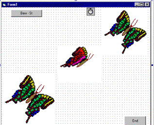 1. Создать на форме 3 элемента управления Image (при вставке рисунков (используется свойство Picture) использовать файлы Bfly1 и Bfly2, см. табл. 1.5), 2 объекта CommandButton и объект Timer, рис. 1.9
