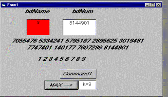 Задание: создать список названий городов, создать список соответствующих численностей населения. Найти максиальную численность населения и соответствующее название города. Последовательность действий: 1. создать на форме: o 2 командные кнопки (Command1 и Command2 (Caption = MAX)), рис. 2.7 o 2 текстовых поля (txtName, txtNum) для вывода отдельных текущих названий городов и численностей населения городов соответственно, 4 поля Label (2 из них - для вывода всех названий городов и численностей населения городов соответственно и 2 (вверху формы) - для надписей), текстовое поле (Text1) для вывода названий городов, см. процедуры Command1_Click () и Command2_Click () и рис. 2.7 2. ввести код, данный ниже и стартовать программу. Последовательным нажатием первой командной кнопки создать массив названий городов. Cделать щелчок на второй командной кнопке. (General) (Declarations) ' описание массива названий городов; здесь - целых чиселDim citiesName(20) As String ' описание массива численностей населения городовDim citiesNum(20) As Long Dim k As Integer ' переменая к используется в процедуре Command1_Click(), ' поэтому не должна описываться как StaticPrivate Sub Form_Load()Dim j As Integer' создание массива численностей; здесь название города - это ' значение переменной-счетчикFor j = 1 To 9 citiesNum(j) = Int(Rnd * 10000000 + 1)txtNum = citiesNum(j): txtName = j' вывод численностей населения в поле Label3Label3 = Label3 & " " & citiesNum(j) Label4 = Label4 & " " & j ' вывод названий городов в поле ' Label4Next jcitiesNum(j) = -1 ' признак конца маcсиваtxtNum = citiesNum(j) txtName = j End Sub' последовательным нажатием командной кнопки создать ' массив названий городов citiesName(k)Private Sub Command1_Click()k = k + 1' если численность населения больше 0, то заполнить массив ' названий городов и вывести данные в текстовые поляIf citiesNum(k) > 0 Then txtNum.Text = citiesNum(k): citiesName(k) = ktxtName.Text = citiesName(k)Else ' иначе вывести сообщение: " Список городов исчерпан" txtName.Text = " Список городов исчерпан" txtName.BackColor = vbGreenEnd If' название города, в котором нет населения (10) вывести в ' текстовое полеText1.Text = " k = " & k End Sub' с помощью поцедуры Command1_Click() созданы названия ' городов, ранее созданы соответствующие численности ' населения: масивы - citiesNum() и citiesName(). Процедура ' Command2_Click() обеспечивает поиск максимума' численности населения и названия соответствующего' городаPrivate Sub Command2_Click()' maxNum - переменная для хранения максимальной ' численности населения Dim maxNum As Long ' maxName - переменная для хранения названия города с ' максимальной численностью населения Dim maxName As String If citiesNum(1) < = 0 Then txtName = " Массив пуст": GoTo 100' пусть максимальным будет первый элемент массиваmaxNum = citiesNum(1)maxName = citiesName(1)' начиная с к = 2 проводится сравнение элементов массива с ' максимальным значениемk = 2 ' если масcив численности населения не пуст, сравнить ' (последовательно) текущий элемент с максимальным. Если ' он больше текущего максимума, то сделать его ' максимальным; в текстовое поле вывести ' соответствующее значение20 If citiesNum(k) > 0 ThenIf citiesNum(k) > maxNum Then maxName = citiesName(k): maxNum = citiesNum(k)Text1.Text = " k=" & k: k = k + 1: GoTo 20 Else' вывод максимальной численности, вывод названия ' города с максимальной численностью населенияtxtNum.Text = maxNumtxtName.Text = maxNameEnd If100 End Sub