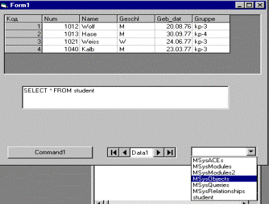 2. создать на форме объекты (см. рис. 4.4 и код, данный ниже): o MSFlexGrid (см. выше), o CommonDialоg: Проект o CommandButton (Name = Command1), o Data (Name = Data1, Connect = Accеss), o ComboBox (Name = Combo1, Style = 0), см. 10.1, o TеxtBox (Name = Text1), 3. ввести код, данный ниже, пояснения даны под комментариями: Private Sub Command1_Click()Dim i As Integer' очистить свойство объекта CommonDialog, содержащее ' имя базы данных CommonDialog1.FileName = " " ' стартовать CommonDialog CommonDialog1.Action = 1' выводится стандартное диалоговое окно Open; ' нужно выбрать требуемую базу данных.' связать объект Data1 с файлом базы данных, выбранным с' помощью элемента управления CommonDialog1 Data1.DatabaseName = CommonDialog1.FileName ' обновить содержимое элемента управления Data1 Data1.Refresh' читать в цикле имена таблиц базы данных и занести' их в ComboBox (AddItem)For i = 0 To Data1.Database.TableDefs.Count - 1' свойство Count определяет количестко элементов Combo1.AddItem (Data1.Database.TableDefs(i).Name)Next i' после добавления имeн таблиц в ComboBox очистить теку-' щее значение свойства Text Combo1.Text = " " ' введeнный в текстовое поле строку SQL присвоить ' свойству RecordSource элемента Data1 Data1.RecordSource = Text1.Text' обновить содержимое Data1. Реализуется запрос, т.к ' свойству RecordSource присвоено значение строки SQLData1.Refresh' оставшаяся часть кода может быть заменена' следующим оператором присваивания: ' MSFlexGrid1.DataSource = Data1 в Окне свойств. Эта' часть кода нужна лишь для того чтобы пользователь мог' освоить работу с ячейками MSFlexGrid. ' Свойство MSFlexGrid1.Cols - характеризует количество ' столбцов в сетке; Data1.Recordset.Fields.Count - количество ' столбцов таблицы базы данных, к которой сделан ' SQL-запросMSFlexGrid1.Cols = Data1.Recordset.Fields.Count' MSFlexGrid1.Rows - количество строк в сетке ' установить равным 1MSFlexGrid1.Rows = 1' в элементе управления MSFlexGrid1 доступ к строкам и ' столбцам проводится начиная с ячейки (0, 0), ' свойство TextMatrix(X, Y) позволяет получить доступ ' к отдельным ячейкам таблицы For i = 0 To Data1.Recordset.Fields.Count - 1' занести название имeн полей таблицы базы данных в ' первую строку MSFlexGrid1MSFlexGrid1.TextMatrix(0, i) = Data1.Recordset.Fields(i).NameNext i' проверить, является ли запись в таблице (строка) по-' следней; организовать цикл прохода по строкам Do While Not Data1.Recordset.EOF' увеличить количество строк в MSFlexGrid на единицуMSFlexGrid1.Rows = MSFlexGrid1.Rows + 1' цикл переноса данных из Data1 в MSFlexGrid1For i = 0 To Data1.Recordset.Fields.Count - 1' перенос данных данной строки (по полям). Если данные в ' ячейке Data1 имеются, то перенести их в ' таблицу MSFlexGrid1If Not Data1.Recordset.Fields(i) = " " ThenMSFlexGrid1.TextMatrix(MSFlexGrid1.Rows - 1, i) = Data1.Recordset.Fields(i)End If' конец цикла переноса данных из элемента управления Data1 ' в таблицу MSFlexGrid1 для одной строкиNext i' использовать метод MoveNext - переход к ' следующей строкеData1.Recordset.MoveNextLoopEnd Sub4. стартовать проект, ввести в текстовое поле SQL-строку (запрос) SELECT * FROM student, сделать щелчок на командной кнопке, в выведенном стандартном диалоговом окне Open выбрать базу данных stud.mdb. В таблицу MSFlexGrid выводятся результаты запроса. Одновременно в список элемента управления ComboBox выводятся имена всех имеющихся таблиц, рис. 4.4