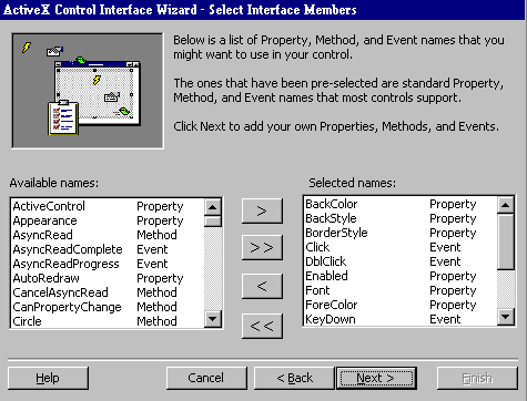 5. после старта программы-мастера во втором окне-ассистенте, рис. 6.13 нужно выбрать имеющиеся параметры из списка: свойства: BackСolor, BorderStyl, Caption, Font, ForeColor, ControlContainer, Picture, Stretch, Interval; событие Resize, для этого: