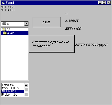 Использовать функцию Windows АPI копирование файла; для этого выполнить следующее: 1. Создать на форме (рис. 7.3): o элементы управления DriveListBox, DirListBox, FileListBox; синхронизировать их работу, обеспечить вывод содержимого каталога после его маркировки и нажатия клавиши Enter, o две командные кнопки, четыре поля метки, см. код процедур, 2. ввести код, данный ниже, пояснения даны под комментариями, 3. стартовать проект, выбрать для копирования файл в дереве файлов, выведенном в поля элементов DriveListBox, DirListBox, FileListBox (здесь - файл Net14.ICO на дискете), маркировать файл. Сделать щелчок на кнопках Command2 и (последровательно несколько раз) на Command1 (Function:) - в поля меток выводятся: имя дискового устройства, имя каталога, путь и имя файла, сообщение о числе копирований файла, рис. 7.3 ' объявление функцииPrivate Declare Function CopyFile Lib " kernel32" Alias " CopyFileA" _(ByVal lpExistingFileName As String, ByVal lpNewFileName _As String, ByVal bFailIfExists As Long) As Long ' описание переменной для хранения возвращаемого функцией значенияDim RetVal As Long Private Sub Command1_Click() ' процедура копирования файла' переменная описана как Static для обеспечения ' многократного копирования файла последовательным' нажатием командной кнопкиStatic i As Integer RetVal = CopyFile(File1, " lpNewFileName", 1) ' копированиеPrint File1 ' вывод имени копируемого файла на форме' вывод имени файла и числа копированийLabel1 = File1 & " Copy " & i + 1 i = i + 1End Sub' синхронизация работы элементов управления Dir1 и Drive1; ' обеспечение вывода содержимого каталога при его ' маркировке и нажатии клавиши EnterPrivate Sub Drive1_Change() Dir1.Path = Drive1.DriveEnd SubPrivate Sub Dir1_Change()File1.Path = Dir1.PathEnd SubPrivate Sub Dir1_KeyPress(KeyAscii As Integer)If KeyAscii = 13 Then Dir1.Path = Dir1.List(Dir1.ListIndex)End Sub' вывод в поля меток имени дискового устройства, каталога, ' пути и имени файлаPrivate Sub Command2_Click() Label2 = Drive1: Label3 = Dir1: Label4 = File1End Sub