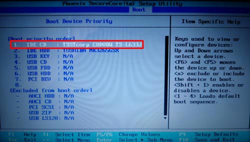 BIOS у вас может быть другой! Я показал на примере своего, у меня и на компьютере и на ноутбуке одинаковый. У своих друзей я видел другой, даже приходилось около получаса искать, где там поставить загрузку с диска! Главное запомните ключевое слово Boot! Ищите эту вкладку, там может быть словосочетание и в нем слово Boot. Найдите, заходите и устанавливайте на первое место загрузку с диска. Вот так у меня на ноутбуке: