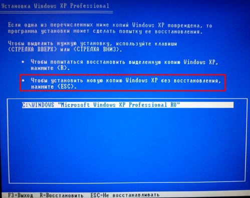 Если вам на данный момент нужно переустановить Windows XP, то есть это не первая установка системы на новый жесткий диск и у вас есть старая операционная система. То в таком случае у нас программа установки предложит восстановить старую копию Windows. Но так как нам это не нужно мы просто нажимаем клавишу «Esc», мы будем устанавливать Windows по-новому.