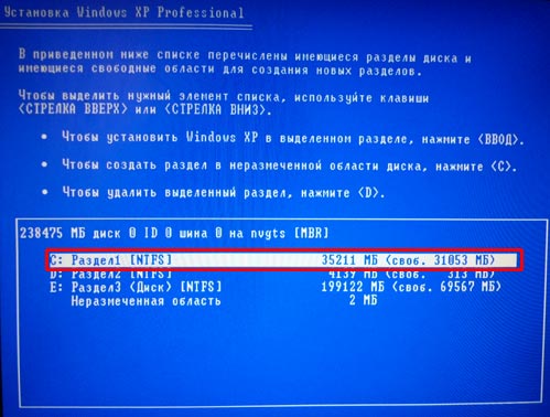 На следующем этапе нам нужно выбрать раздел жесткого диска, куда будет установлена Windows XP. Обычно это диск «C». Выделяем нужный нам раздел, используя стрелки на клавиатуре, и нажимаем клавишу «Enter».