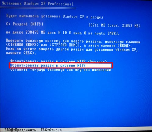 Теперь у нас есть несколько вариантов для продолжения! Мы можем продолжить процедуру и не форматировать диск, тогда у нас будет две системы, старая и новая! Но для успешной установки Windows XP я рекомендую форматировать системный жесткий диск, чтобы все с него было удалено! Также тут есть два способа форматирования, быстрое и обычное. Рекомендую выбрать обычное, хоть оно и не много дольше идет по времени, но оно лучше. Выделяем стрелками и нажимаем продолжить – клавиша «Enter».