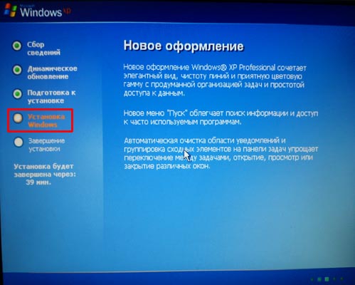 После установки в БИОСЕ загрузки диска, пора уже приступать непосредственно к переустановке Windows XP. Вставляем в привод диск с операционной системой и перезагружаем компьютер. Ждем.. Первое, что мы должны увидеть – синий экран в левом углу, которого будет текст «Установка Windows».