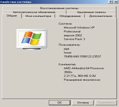 Рис. 1.5. Проверка диска 7. Очистка диска. Данная программа из группы Служебных позволяет удалить до десятков мегабайт на жестком диске за счет удаления файлового «мусора», причинами появления которого являются: удаленные файлы в корзину, временные файлы, накапливающиеся при выходе в Интернет (папка Windows\temporary Internet Files), временные файлы, создаваемые операционной системой и т.п. Данная программа вначале информирует в окне «очистка диска» об удаляемых файлах и решать пользователю, что далее делать. 8 .Дефрагментация диска. Отсутствие ошибок на диске еще не является гарантией его эффективной работы. С точки зрения быстродействия компьютера диск в наибольшей степени его определяет. Каждый файл занимает один или более кластеров, которые не всегда следуют подряд, так как файлы постоянно создаются и удаляются, то есть один файл может занимать группу кластеров, разбросанных по разным дорожкам поверхности диска. В этом случае говорят, что файл фрагментирован, иработа диска начинает замедляться. В этой ситуации может помочь программа Дефрагментации диска из группы Служебных. Вызовите данную программу и внимательно изучите ее использование, не выполняя самой дефрагментации. 9. Сведения о системе. Данная программа находится в папке Системные программы: Пуск, Панель управления, Система (рис.1.6). Позволяет получать подробные сведения об устройствах компьютера, драйверах и т.д. Изучите различные вкладки данного окна. 10. Оценка функционирования компьютера. В Windows XP имеется специальная программа Производительность в папке Панель управления, значок Администрирование.