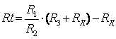 НИ–нуль-индикатор (гальванометр); R1, R2– постоянные резисторы; R3– регулируемый резистор; Rt– измеряемое сопротивление; RЛ– сопротивление линий (соединительных проводов); ab – диагональ питания; cd – измерительная диагональ.
